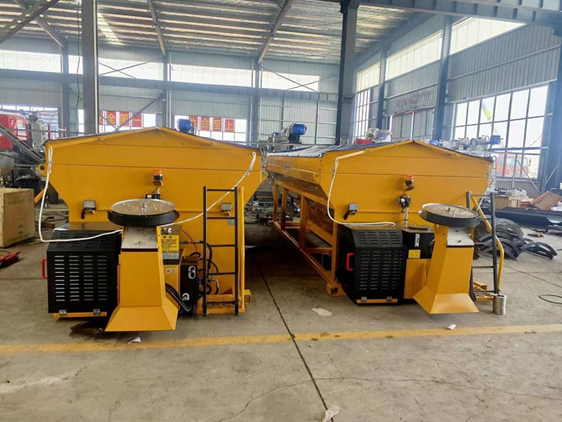 通过液压泵带动马达旋转,把料斗中的融雪剂输送到撒料盘,由马达带动高速旋转的撒料盘把融雪剂均匀撒出。
