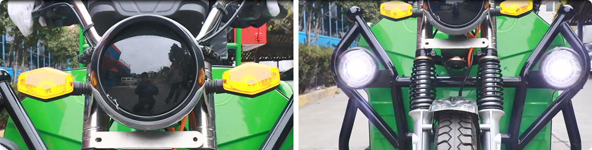 灯具:前大灯、后尾灯 LED 照明灯具有低能耗及环保优点及左右 转向灯、刹车灯、行车灯、仪表、电喇叭、工作警示灯等
