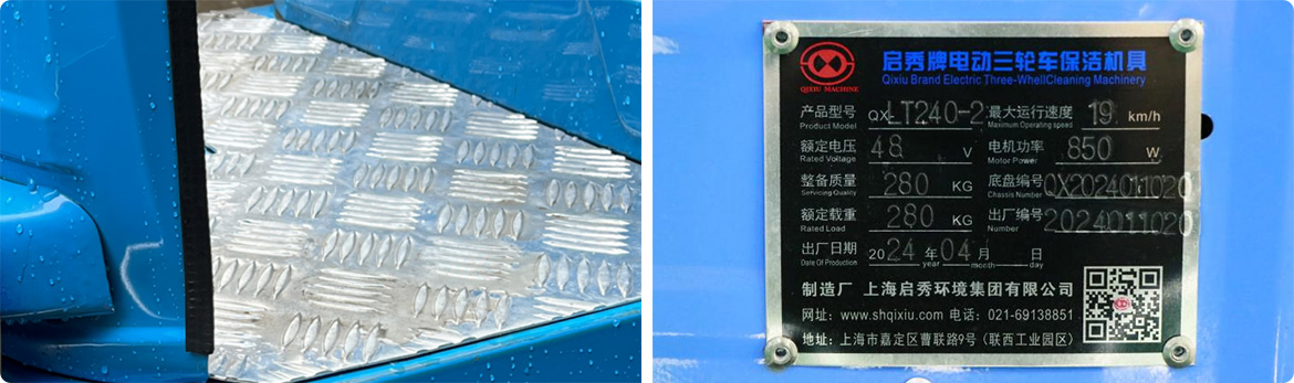 4、2mm厚脚踏防滑铝板:便于清洗永久耐用 / 铭牌标识:认准启秀牌更专业更放心