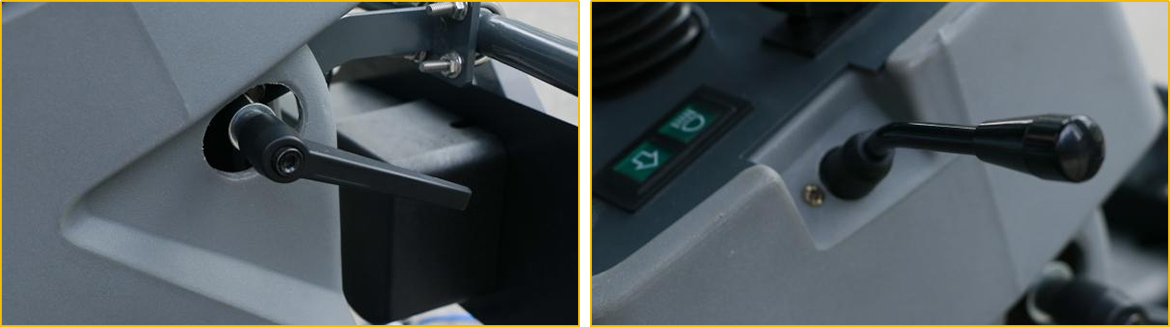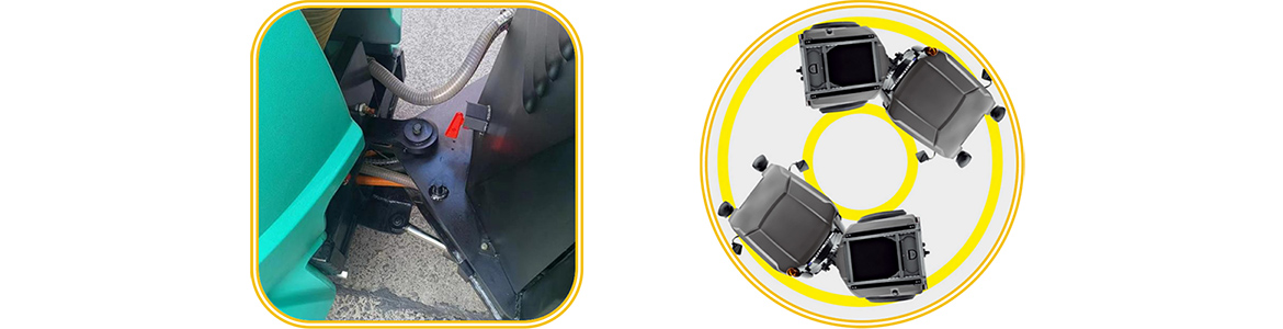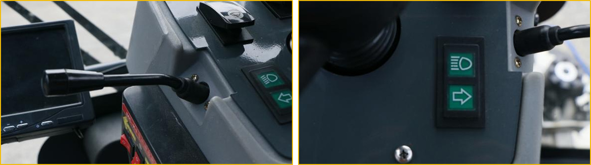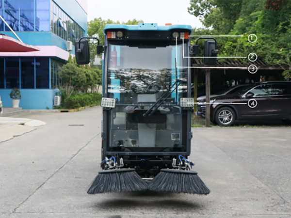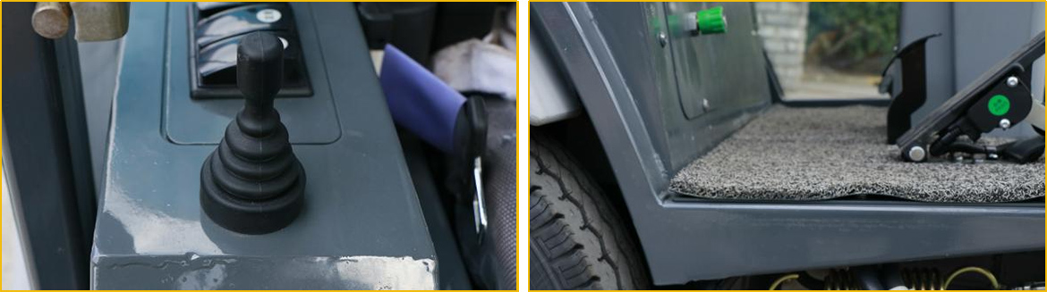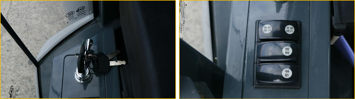 开关:启动开关、灯光及雨刮组合开关、前后换向、警示灯开关、一键工作、定速开关、箱体升降开关、扫刷转速调节旋钮