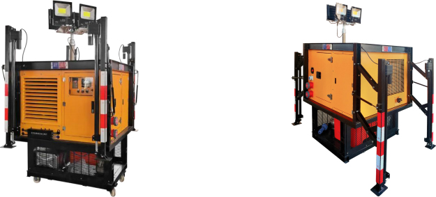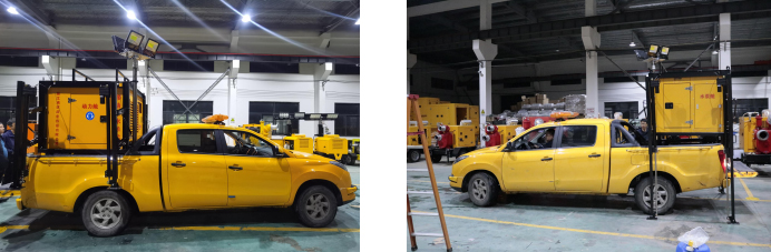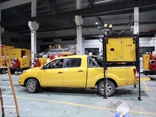 配柴油发电机,机组运行稳定,采用三相四线制。具有户外照明功能、发电功能、大排量排水功能等三种 功能自由切换.适用各种不同抢险场景的施工保障。有可视化操作界面,实时监测运行参数,带有一键启停、 远程控制启停功能、运行时间统计功能,当前显示时间、故障报警等保护功能、GPS 定位功能。